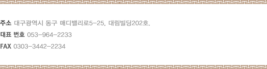 ÁÖ¼Ò : ´ë±¸ ±¤¿ª½Ã µ¿±¸ ¸Þµð¹ë¸®·Î5-25, ´ë¸²ºôµù202È£ | TEL : 053-964-2233 | FAX : 0303-3442-2234 | ji-cheong@naver.com